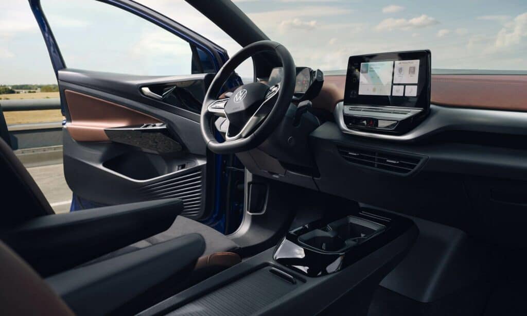 I dettagli di design si fondono in armonia, con cerchi in lega leggera fino a 21″ dalle forme fluide, mancorrenti sul tetto per praticità di trasporto, e gruppi ottici posteriori a LED 3D con indicatori di direzione dinamici. Un vero highlight è la linea di luce, disponibile su richiesta, che abbraccia il logo Volkswagen, conferendo all’ID.4 un carattere inconfondibile.